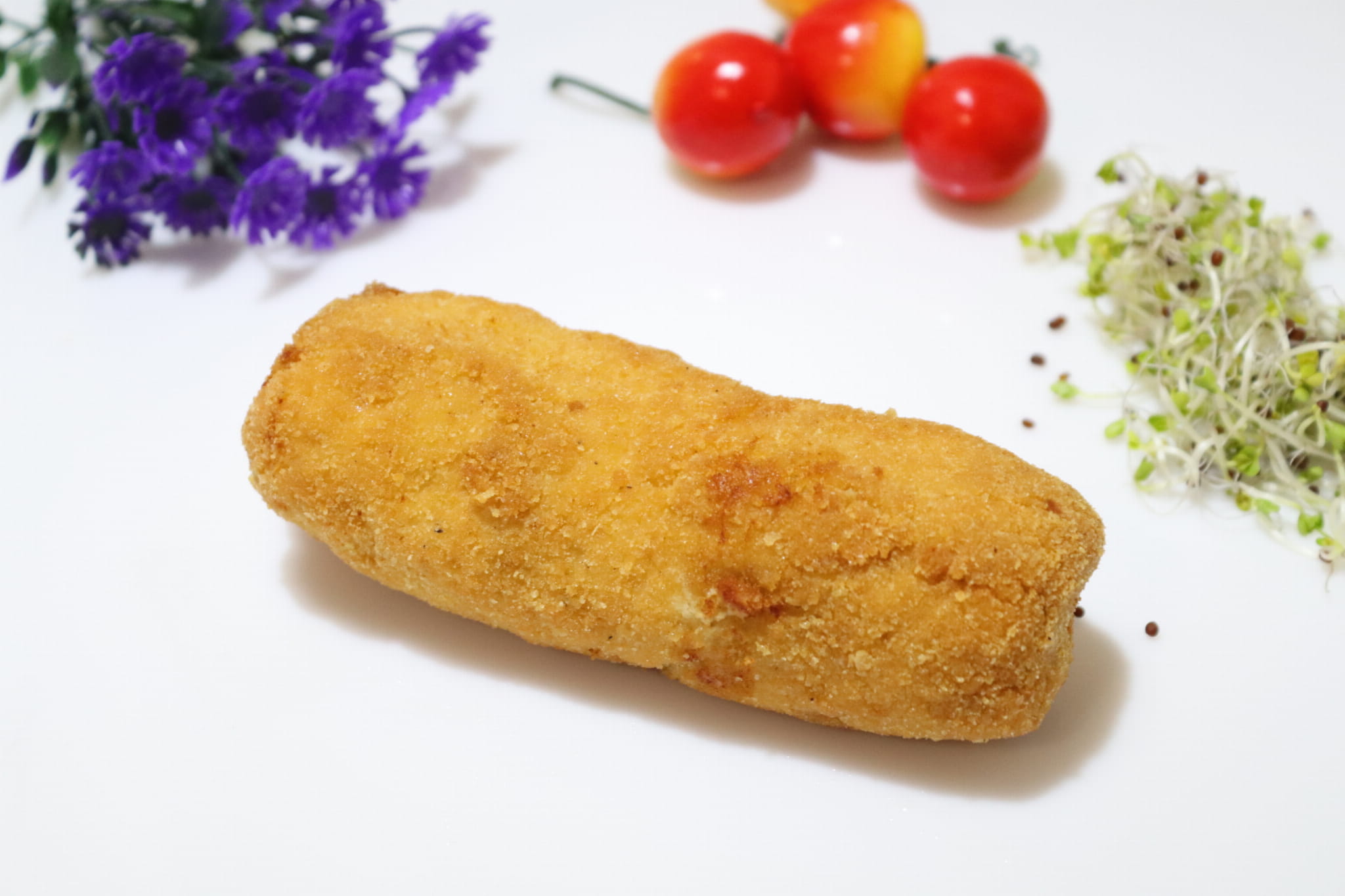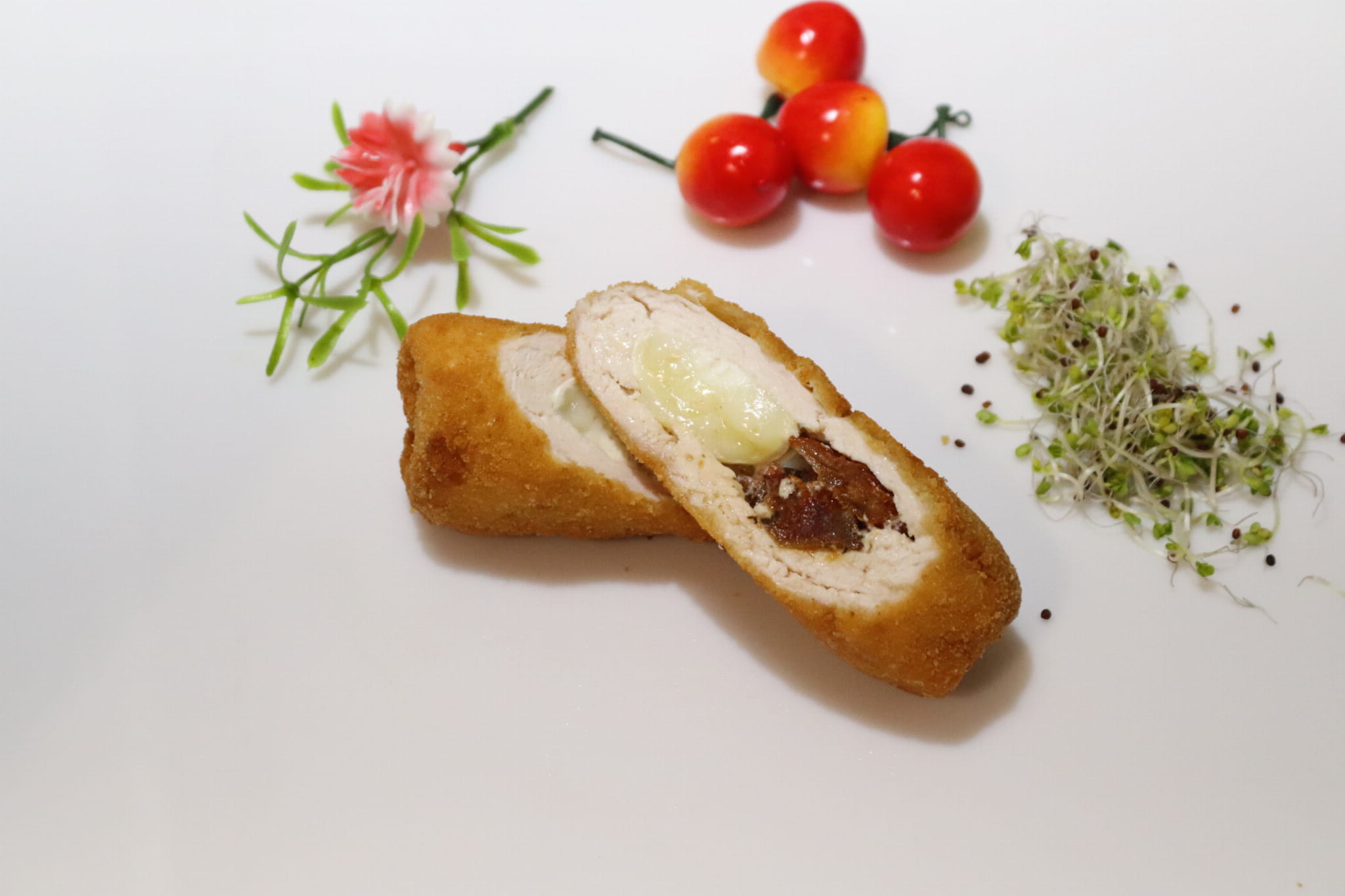 Panierowana roladka drobiowa nadziewana suszonymi pomidorami i kozim serem.