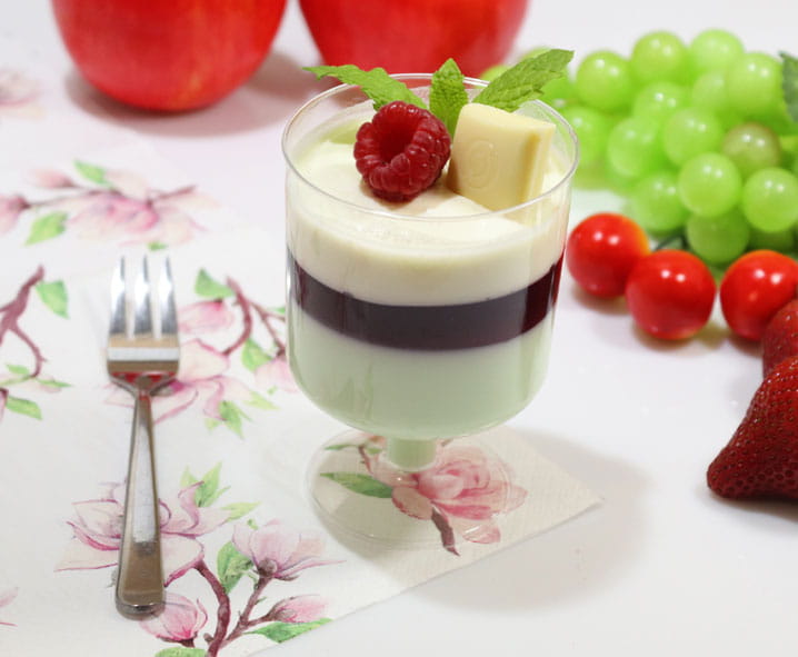 Deser z pianką agrestową galaretką wiśniową i musu chałwowego na bazie białej czekolady.