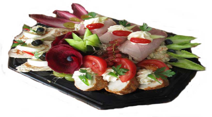 Patera zawiera: Jajko w szynce na sałatce 3 porcje, Polędwiczka w ziołach 3 porcje, Rolada drobiowa z morelami 3 porcje.