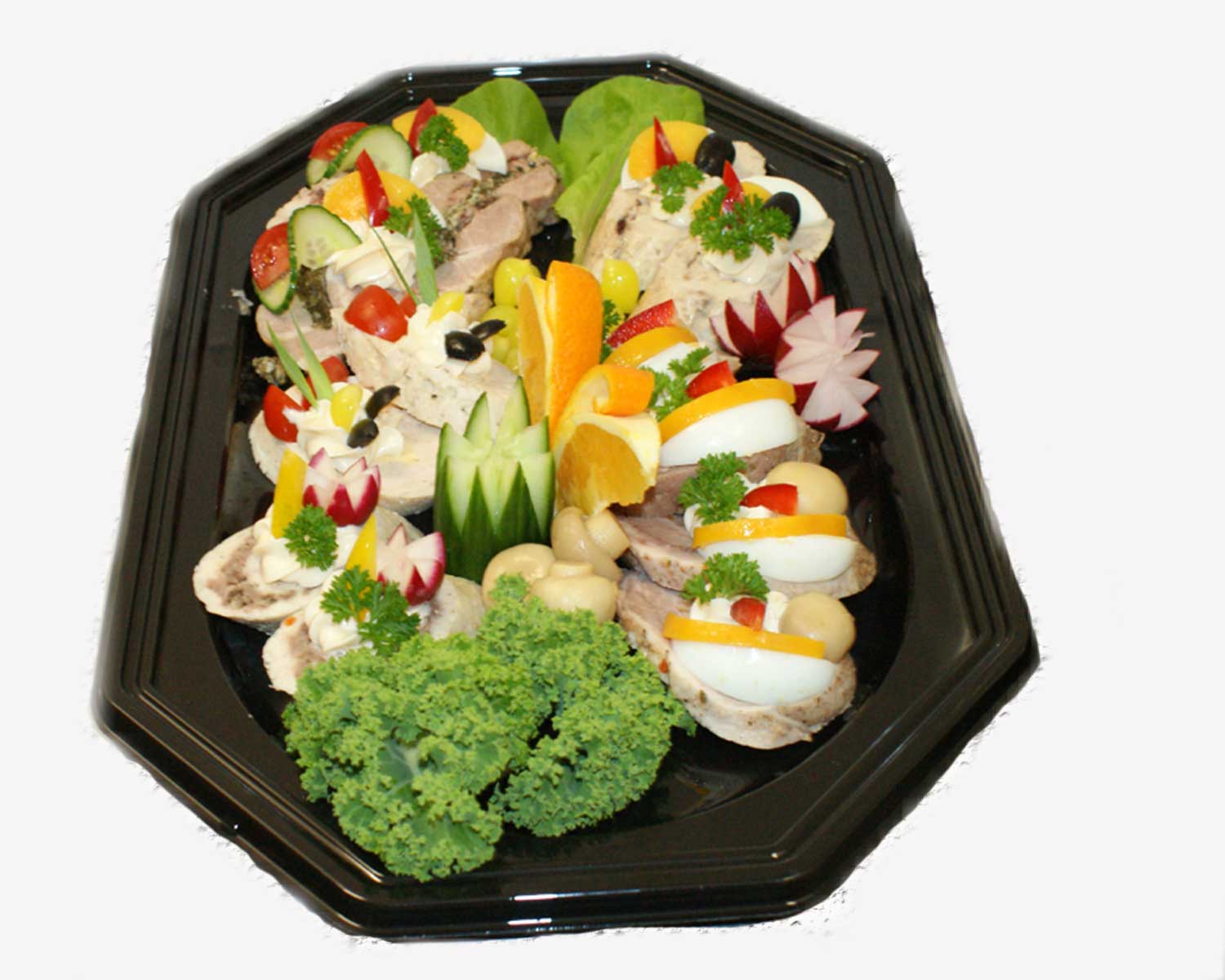 Patera zawiera: Grzebień z karkówki 3 porcje, Rolada drobiowa z omletem 4 porcje, Rolada drobiowa z pieczarkami 2 porcje, Rolada ze schabu ze śliwkami 4 porcje.
