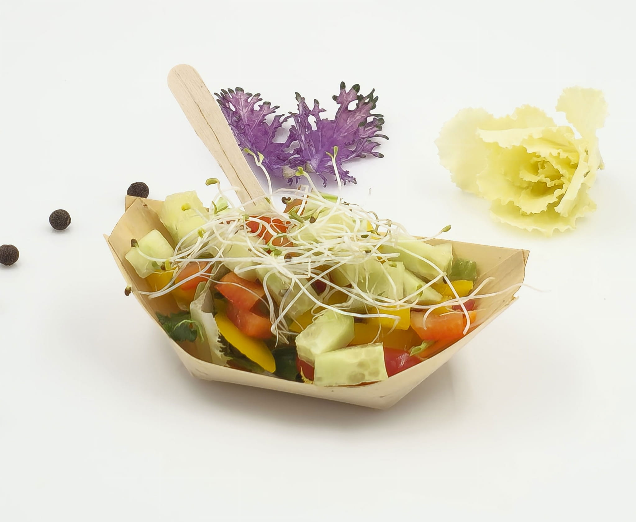 Przekąska bankietowa serwowana w miseczkach drewnianych jednorazowych z widelczykiem.