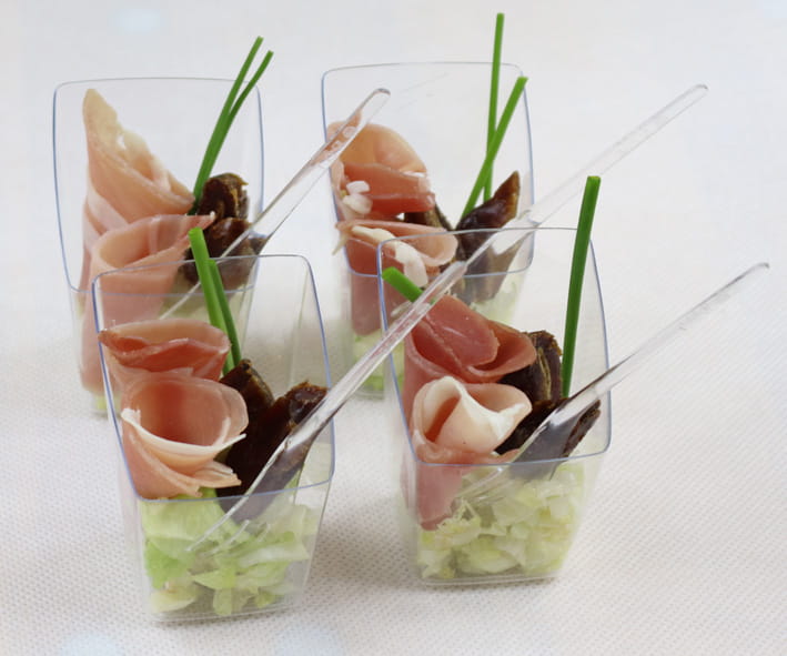 Monoporcja wytrawna (przekąski w kieliszkach) składająca się z szynki włoskiej, daktyli i sałaty.