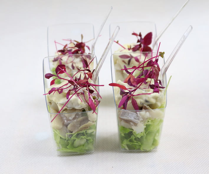 Monoporcja wytrawna (przekąski w kieliszkach) składająca się z matiasów, sałaty, sosu tatarskiego.