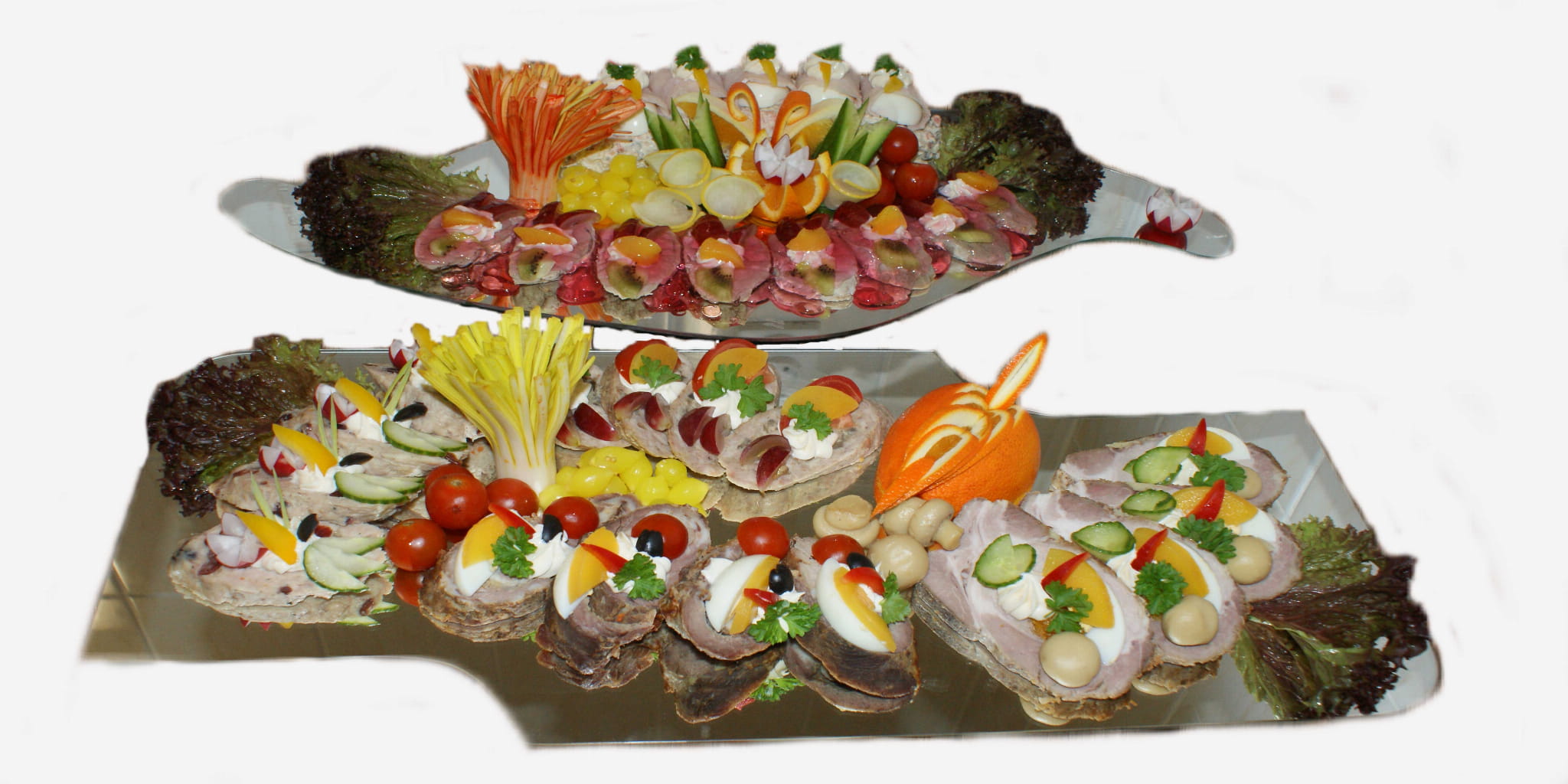 Patera zawiera: Polędwiczki w zalewie cytrynowej 8 porcji, Jajko w szynce na sałatce 6 porcji, Rolada z karkówki 4 porcje, Grzebień z karkówki 4 porcje, Rolada drobiowa z żurawiną 4 porcje, Rolada drobiowa z pieczarkami 4 porcje.